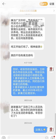 4月24日上午9时许,广汉市城市管理行政执法大队新丰中队联合和平村及滨河小区物业,前往现场进行调查处理。经查,该小区后门存在两家住户饲养家禽,根据《德阳市城市管理条例》第十三条第四款之规定,要求该两家住户及时将家禽处理完毕。至4月25日,2家住户已将全部家禽处理完毕。同时,对占用消防通道违规搭建养鸡棚,要求其立即搬离占用消防通道的物品,同时自行拆除违章建筑。经现场协调,由该小区物业协助被投诉人在5月5日前将养鸡棚拆除完毕。