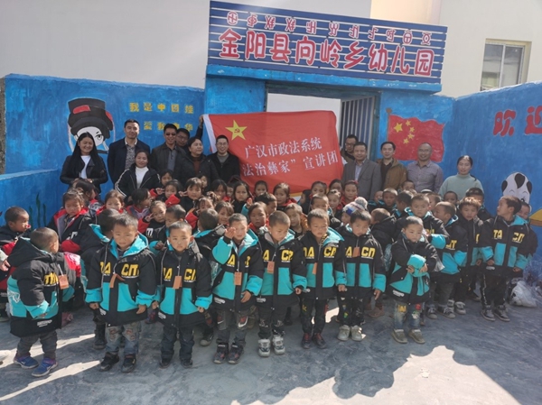 活动期间,陶永东一行还到金阳县向岭乡开展法律服务活动,给彝族人民群众发放广汉市援彝指挥部编印的《金阳县小学生健康安全礼仪知识读本》170本,“法治彝家”宣讲手册300余份,并现场解答村民的涉法问题。同时,还向164名幼儿园小朋友捐赠了价值2万余元的防寒服。“卡沙沙……”“叔叔好!”“谢谢叔叔。”孩子们稚嫩的声音,一张张灿烂的笑脸,表达的不仅仅是感谢和喜悦,更多表现出的是彝家美好的未来和希望。