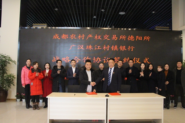 2018年12月26日,成都农交所德阳所和广汉珠江村镇银行签订了《农村产权交易服务战略合作协议》,为农村产权与金融机构服务架起了一座桥梁,并促进金融服务与农村产权的深度融合,切实推动农村产权金融服务下乡惠民,破解农业农村发展融资瓶颈问题。