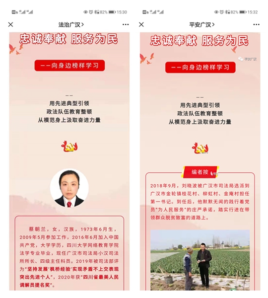 树立先进标杆。对标先进找差距,比学赶超提质效。选树一名平凡英雄刘晓波、一名工作先进蔡朝兰,在“法治广汉”微信公众号、“广汉司法”微博予以宣传。在每周的理论学习中,安排学习一位先进人物事迹,现已学习了黄继光、德阳最早的党员萧朴生、“全国模范法官”周春梅、人民英雄阿真能周先进事迹,引导干部要把榜样精神力量转化为开展工作的动力,用实际行动践行“两个维护”,以“三牛精神”激励新征程。