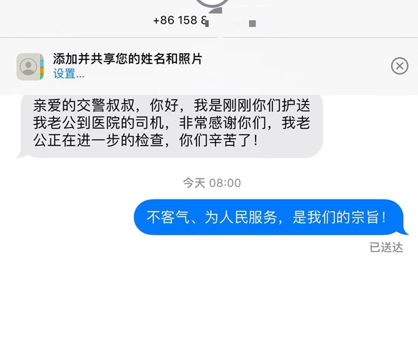 确认救助人员得到及时救治后,辅警卢涛、何晓才驾车离开。不久后,两人还收到了李先生的家属朱女士发来的感谢短信。