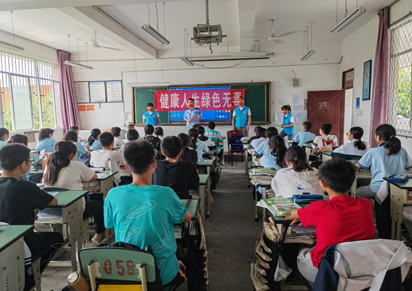 活动现场,工作人员向在场学生发放宣传资料、组织观看禁毒宣传片并讲解什么是毒品、毒品种类、毒品危害、青少年吸食毒品的诱因分析及怎样才能做到远离毒品等相关知识,号召广大学生深刻认识毒品给我们带来的巨大危害,珍爱生命,远离毒品,做禁毒理念的传播者,以“小手拉大手”,发动更多的人民群众参与禁毒斗争,携手并进,共建和谐美好家园。