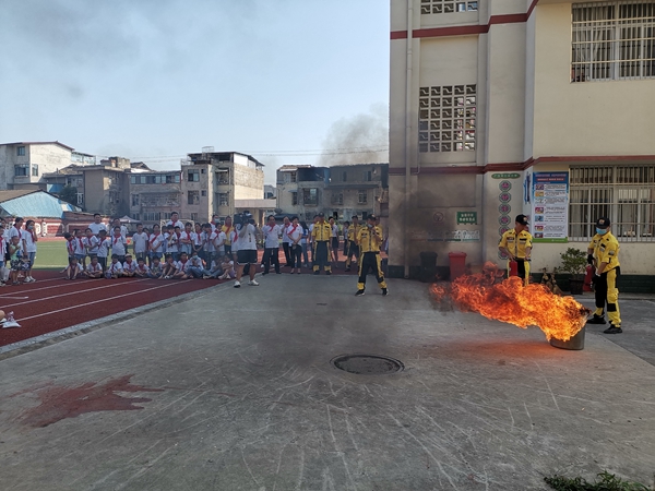 应急培训教学生动展开。100名少年急救官分成3支队伍,由四川公羊会的3位教员分别带领1支队伍现场教学海姆立克自救互救法、溺水的自救互救法、触电的自救互救法等急救常识及学生实际演练互动。环节最后模拟火灾情景,100名少年急救官以应急疏散态势分别有序撤离至学校演播大厅,然后有序入座准备室内视频展示和模拟演练。
