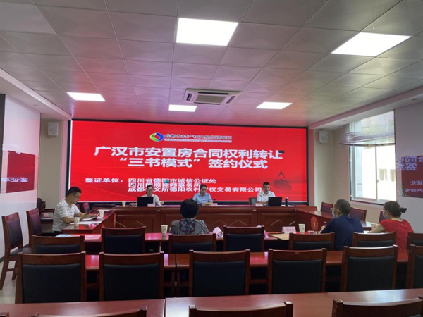 四川新闻网消息 8月9日,广汉市汉州街道京皇社区联合成都农交所德阳所、四川朗照律师事务所、四川省德阳市诚信公证处以及安置房受让方和转让方在广汉市政务服务中心举行了安置房合同权益转让“三书模式”签约仪式。