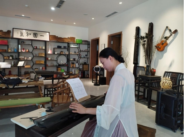 在初晓新中式生活馆,身着汉服的江环正在教授孩子们茶艺,在舒缓的古琴声中,孩子们学得有模有样。生活馆于2021年正式开放,主要传授茶艺、琴艺、棋艺,组织文化艺术交流活动。