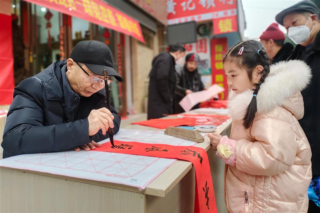 早上9点,书法家们的“摊位”前便排起了长队,大人们牵着小孩儿,老人们提着菜篮儿,纷纷驻足观看,只为求得一份“墨宝”。