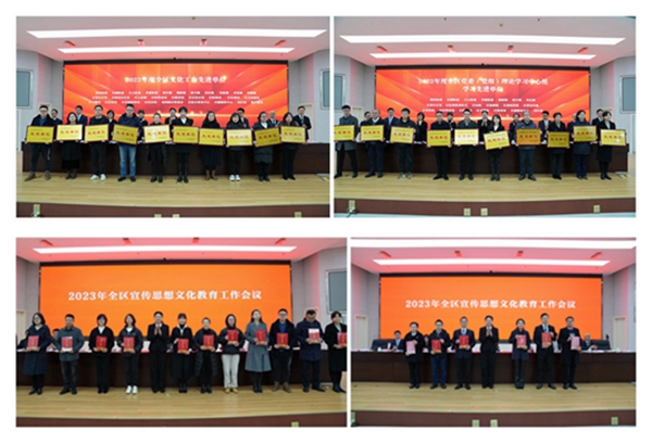 会议表扬了2022年度党委(党组)理论学习中心组学习、外宣工作、“爱旌阳”新闻宣传、网信工作、精神文明建设专项工作、文化工作先进单位,全区宣传思想文化教育系统相关单位认领了2023年度重点目标任务。