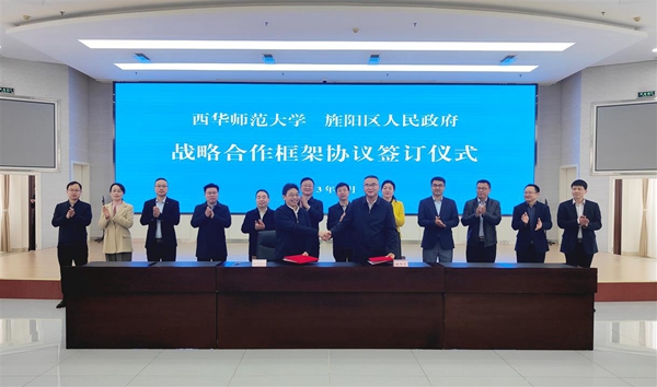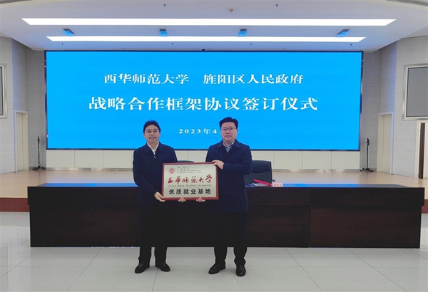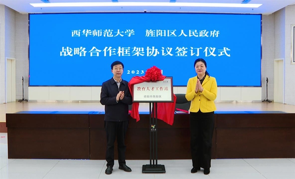 仪式上,西华师范大学与旌阳区人民政府签订战略合作框架协议,同时为旌阳区、西华师范大学共建教育人才工作站揭牌,为西华师范大学优质就业基地授牌。