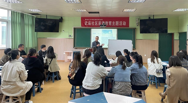 在新东方德阳天元烛光小学校,天元街道武庙社区联合四川映画武庙城市更新建设发展公司开展的新时代文明实践站系列活动之“家校社”协同共育家庭教育主题活动正在进行,授课老师以“亲子关系在孩子成长过程中产生的心理问题”为题,就“校园暴力霸凌现象”“孩子社交”“父亲模范作用”等方面进行讲解,通过理论讲解、案例分析、情景互动等方式,引导家长们正确保护孩子的自尊心和自信心,促进青少年心智健康发展。