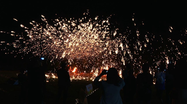 晚上八点半,最具特色的非遗技艺“打铁花”民俗活动精彩上演,表演者舀出铁水,将铁水抛起,伴随着动感的音乐,一串串耀眼的铁花在夜空绽放,灿烂夺目,蔚为壮观。