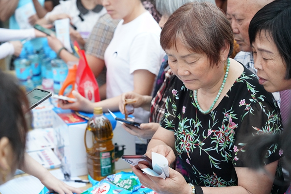 6月1日傍晚,在友谊村谢家大院共建广场,村民们正热烈地讨论着各自的积分情况,村两委一边详细地介绍着积分兑换的类型和物品情况,一边线上线下共同进行积分登记,依据“村级事务平台”的积分数,村民现场核销兑换到了食用油、大米、洗衣液等日常用品共计2500分。