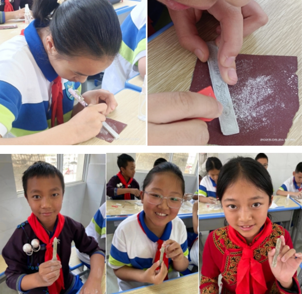 在制玉的过程中,孩子们在老师的引导下,结合三星堆相关文物及本民族特色图形等元素,从设计草图到刻图、打磨,通过一个多小时的劳作后,当见到自己的作品从一块毛胚石到自己的专属图案的呈现,创作出赋有自己民族特色的独一无二的作品来时,每一个孩子的眼里都闪着自信的光芒。
