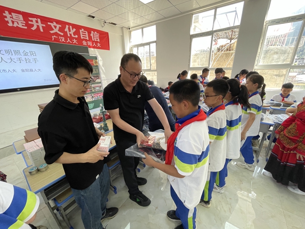 彝汉一家亲,广汉市人大常委会法工委曹光军主任、广汉市人大预算委曾令军主任、广汉市人大代表服务中心程相友主任协同金阳县人大陈征主任为本次参加活动的所有孩子们送上了三星堆徽章、书签、绘本、书籍等文创纪念品和书包、钢笔、笔记本等学习用品。由广汉市人大常委会牵头策划的“弘扬古蜀文化 提升文化自信”活动圆满结束。此次活动,广汉人大为传承三星堆历史文化注入了新的力量,为金阳县城关小学的孩子们开启了一扇求知探索发现的窗。