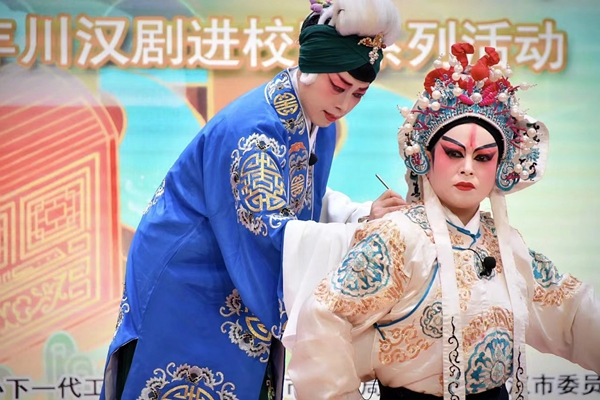 “怎么演出才能让学生感兴趣、看得懂?”市关工委和剧团负责人动了很多脑筋,大家一致认为“首先要进行基础知识的普及”,活动的第一个环节“戏剧大讲堂”应运而生。每场演出都是在戏曲打击乐中正式开始,在我国300多个戏曲剧种中,如果只听打击乐,很难直接地分辨出京剧、评剧、昆曲甚至诸多剧种的不同。川汉剧团的艺术家们首先对演奏戏剧音乐的乐器种类及发挥的作用进行了介绍和演示,“当丑当丑”的打击乐一响起,台下的学生们立刻大声判断“这是川剧!”。随后,对戏剧舞台中生、旦、净、末、丑各行当和道具进行了讲解及示范表演,艺术家们表示各行当均有自成体系的功法程序,其中以文生、小丑、旦角的表演最具特色。各种表演形式配合讲解,在欢乐的气氛中为同学们普及了川剧、汉剧的基础知识、发展历程、艺术形式。