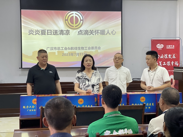 7月11日正值入伏,市委常委、宣传部部长、市总工会主席阙显凤率领广汉市总工会干部职工,带上加多宝凉茶、藿香正气口服液等消暑物品,先后到邮政物流供配中心、四川航佳生物科技有限公司、市环卫系统等企业单位,为战高温、斗酷暑的一线职工送去党和政府的亲切关怀、工会组织的温馨问候。在慰问现场,阙显凤详细询问了解职工的工作情况,对大家不辞劳苦高温下仍坚守岗位搞好生产,为广大市民群众提供便利的生活服务、整洁的生活环境所表现出的良好精神风貌给予赞许,并叮嘱大家提高自我保护意识,做好高温季节自我保护,做到工作和身体健康两不误。同时,要求各企业单位加强劳动保护措施的落实,确保职工劳动健康权益得到切实的维护。