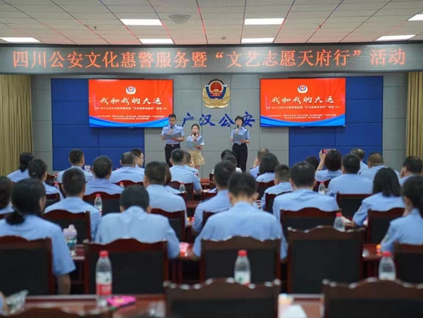 为进一步凝聚警心、激励斗志、铸就忠诚警魂,深入推进公安文化建设、丰富警营文体活动,构建和谐警营,近日,由四川省公安厅组建的文化惠警服务小分队深入基层、走进广汉公安开展“四川公安文化惠警服务”暨“文艺志愿天府行”活动,向广汉市奋战在基层一线的广大民(辅)警、职工送祝福、送温暖。