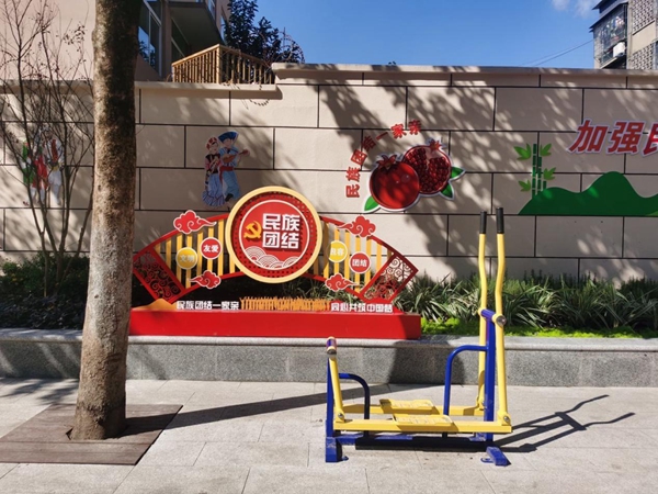 如今,经过打造的红土地庙巷已完成“华丽转身”,环境面貌焕然一新。原本斑驳破损的老旧墙壁变成干净整洁、色彩靓丽的民族文化墙,路平了,景美了,民族团结氛围感直接拉满。还增添健身器材及公共座椅,为群众提供了一个休闲锻炼、享受阳光的好场地。