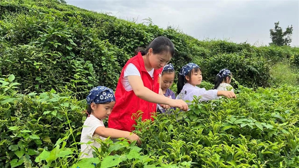 小朋友们三五成群,按照专业老师的要求,在绿意盎然的茶园里寻找茶叶新芽,一芽一叶、两芽一叶,稚嫩的小手不断翻飞,不一会儿的工夫,嫩芽就装满了小竹篓。“今天我知道了,采茶是采一芽一叶,而且过程非常辛苦,所以我们要学会珍惜。”小朋友谭正说。