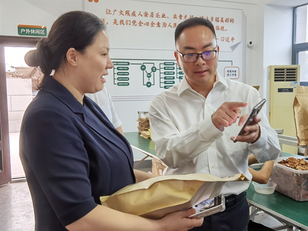 走进南塔社区庇护工场,只见工人们正忙着对药材进行分量、称重、装袋,按照药方将其制成足浴包。冯金伟和钟娜在了解庇护工场的基本情况后,仔细查看庇护工场制成的产品,并与工人们进行攀谈,就庇护工场产品销售、员工权益等内容作进一步了解。