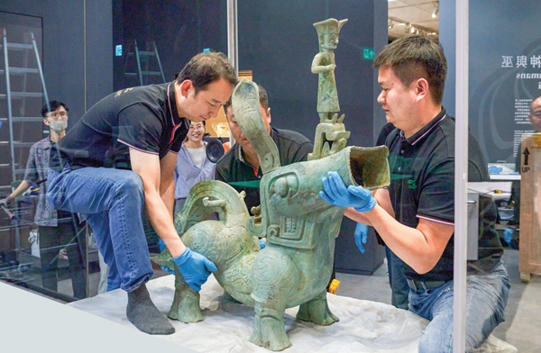 | 9月18日,布展团队工作人员摆放文物“青铜大神兽”。 新华社发 |