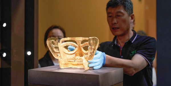 | 9月18日,布展团队工作人员摆放文物“金面罩”。新华社发 |