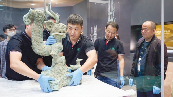 | 9月18日,布展团队工作人员摆放文物“铜虎头龙身像”。 新华社发 |