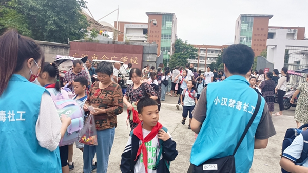 活动中,工作人员在学校门口,向放学的学生及接送孩子的家长发放预防新型毒品宣传单,并讲解新型毒品的种类、伪装特征及其危害,倡导群众积极传递禁毒理念,引导学生及家长了解新型毒品危害,加强防范意识。