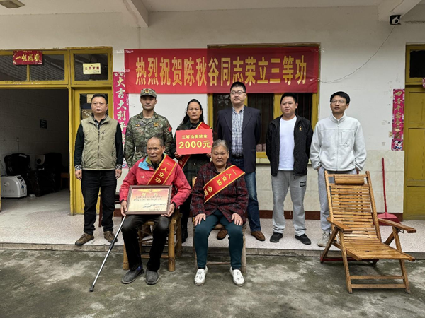 四川新闻网消息 10月27日上午,广汉市向阳镇同兴村一派热闹景象,广汉市人武部、市退役军人事务局和向阳镇相关负责人一行在热闹喜庆的锣鼓声中伴随着秋日阳光来到荣立三等功的广汉籍现役军人陈秋谷家中,为他家人送上“三等功”喜报。慰问组为陈秋谷的家人佩上“一人立功 全家光荣”的绶带送上立功受奖证书和奖励金。整个仪式简单而热烈,吸引了左邻右舍前来围观并纷纷送上赞赏和祝贺。