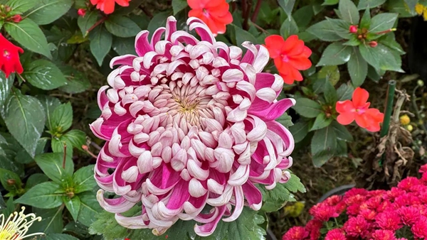 走进展区,不同品种的菊花在秋日中竞相绽放,让人目不暇接。精致的菊艺造型勾勒出一幅美丽的金秋画卷,吸引了不少游客前来一睹秋菊之美。