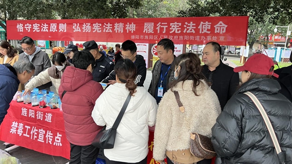 12月5日上午9时,旌阳司法所联合旌阳派出所、街道综治办、应急办、乾盾律师事务所、旌湖公证处、西小区社区在华山路法治文化广场开展宪法周宣传。