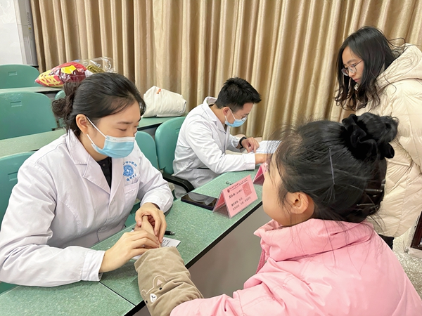 在活动现场,医生们结合教师之前的体检报告,通过“望、闻、问、切”的传统诊断方法,为其提供个性化的义诊服务,针对教师们提出的各类健康问题进行耐心细致讲解。鉴于教师群体普遍患有咽喉炎等职业病,药剂科特别调配了玄麦甘桔茶及助眠安神茶赠予到场教师,以期帮助他们改善身体状况。同时中医美容皮肤科则为教师们赠送了中药头部护理,以期带给他们更加健康的生活方式。