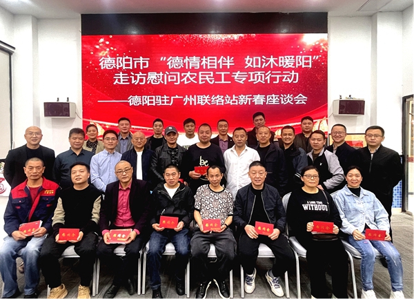 四川新闻网消息 为进一步做好今冬明春服务保障农民工“五件实事”,近日,德阳市就业创业促进中心主任王宇,市人力资源服务中心主任张浩一行赴广州开展“德情相伴 如沐暖阳”慰问德阳籍农民工暨联络站复核活动,为农民工朋友们带去党委政府的问候和关爱。绵竹市人社局、农民工服务中心主要负责人随同慰问。