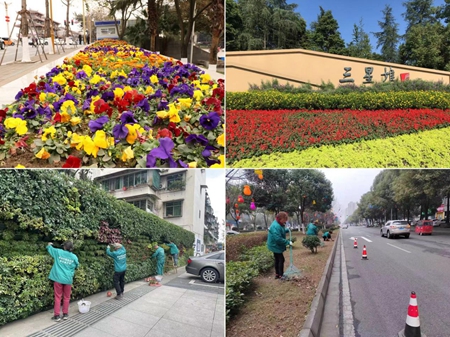美化街景构筑“靓色”。按照“红+黄+紫”搭配方式,以花期长、颜色喜庆艳丽的金鱼草、地阳菊、虞美人、欧洲月季、杜鹃等10余品种为主,对全市建成区花坛、花箱、花境、立体花墙及主要景观节点进行时令花草更换,重点对城区中山大道、旅游大道、湘潭路、公园、广场等重要场所精心布置,使花草与周围环境相映成趣,提升市民的视觉观感。此次换花面积达2000余平方米,共计10万余株。利用高枝剪等工具,对辖区主次干道两旁树木上的塑料袋、残破条幅、纸片等“树挂”垃圾,进行彻底清理,并加强对辖区白色污染的巡查力度,第一时间发现,第一时间清理。