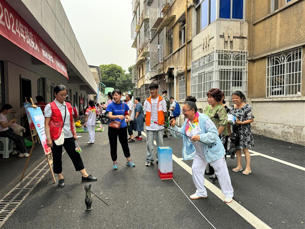 乐团的演奏拉开了此次活动的序幕。舞台上,双人合唱、柔力球表演、“你画我猜”等互动小游戏点燃了现场气氛。舞台旁,欢乐套圈、巧夹弹珠、趣味投壶、蒙眼摸福等游园游戏点位上,大家有序排队,积极参与,现场热闹非凡。