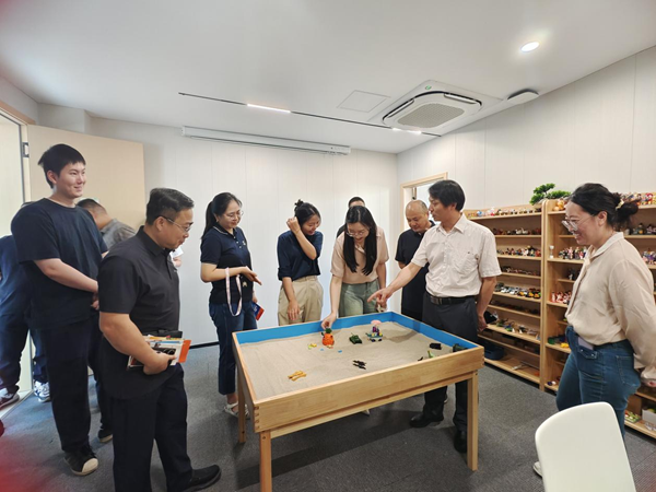随后,来到心理治疗室,调研团队被治疗室的沙盘治疗区吸引。调研团成员在现场摆放了各种小型模具,构建了一个充满想象力的场景。张院长与组员进行了深入的交流和探索,引导他们表达内心的想法和情感,并通过趣味解答的方式,让参与者在轻松愉快的氛围中获得了心灵的释放。