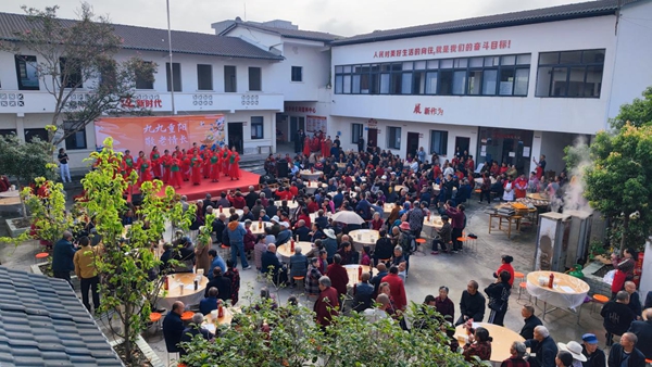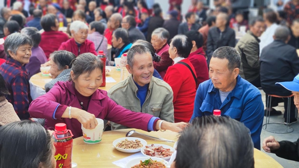 表演结束后,一场热闹的坝坝宴拉开帷幕。长长的桌椅在村委会广场依次排开,一道道美味的菜肴散发着诱人的香气。老人们围坐在一起,一边品尝着美食,一边拉着家常,脸上洋溢着幸福的笑容,深深感受到了村集体的温暖与关爱。