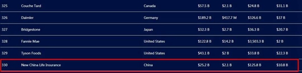 新华保险连续第七年进入榜单前500强,榜单期内,公司营收为252亿美元,利润21亿美元,资产1258亿美元,市值108亿美元,居榜单第330位,比去年上升6位。