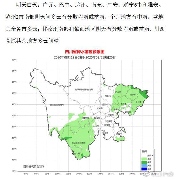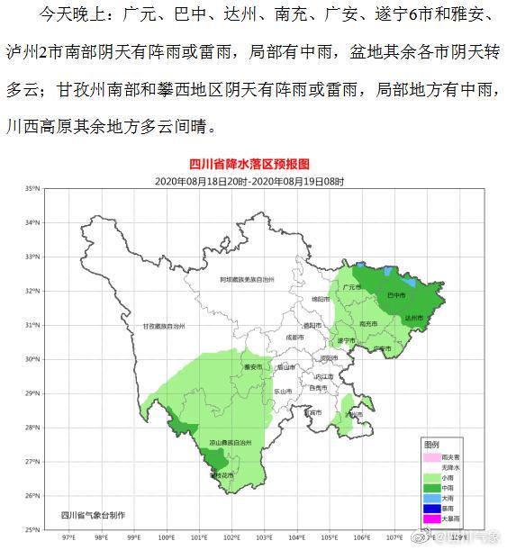 今天晚上到明天白天:广元、巴中、达州、南充、广安、遂宁6市和雅安、泸州2市南部阴天有阵雨或雷雨,局部有中到大雨,盆地其余各市阴天转多云;甘孜州南部和攀西地区阴天有阵雨或雷雨,局部地方有中雨,川西高原其余地方多云间晴。24小时内,盆地最低气温:19~22℃;最高气温:西部26~28℃,东部29~32℃。
