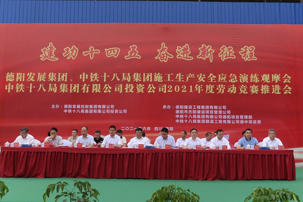 四川新闻网消息 为贯彻落实2021年全国第20个安全生产月“落实安全责任,推动安全发展”活动主题,提升项目参建人员安全生产意识,营造“安全管理,人人有责”的氛围,创建“人人管安全,人人要安全”的和谐企业。2021年6月18日,由德阳发展集团与中铁十八局集团在什德中快通德中示范段项目施工现场联合主办了施工安全应急救援演练活动。市一级巡视员杨庆龙,市交通局党委书记、局长李麒麟,发展集团公司党委副书记、总经理张锐,中铁十八局集团公司相关班子成员以及各单位相关负责人,多家建设、监理、施工单位负责人共240余人观摩了应急演练活动。