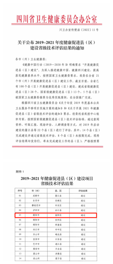 四川新闻网消息 6月15日,四川省卫生健康委员会办公室发布《关于公布2019-2021年度健康促进县(区)建设省级技术评估结果的通知》。旌阳区顺利通过省级健康促进区技术评估,成功创建为省级健康促进区。