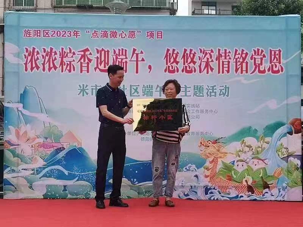 活动在舞蹈《我们的生活充满阳光》中拉开了序幕,米市坝社区党委书记陈辉致辞,并为城馨家园小区业委会授予旌阳区2022年度“幸福美好家园”标杆小区牌匾。随后在文艺汇演环节中,通过小区居民自选自报的节目和有奖问答将本次端午活动推向了高潮。