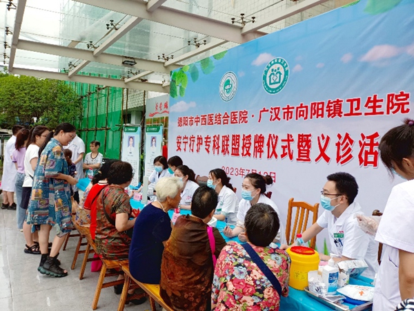 四川新闻网消息 近日,德阳市中西医结合医院•广汉市向阳镇卫生院安宁疗护专科联盟授牌仪式暨义诊活动在广汉市向阳镇卫生院成功举行。德阳市中西医结合医院副院长李蕾,德阳市安宁疗护专科联盟秘书长贾应鑫,广汉市卫生健康局党委委员、市红十字会常务副会长俸伟,广汉市向阳镇卫生院院长唐孝国及两院相关科室负责人参加仪式。