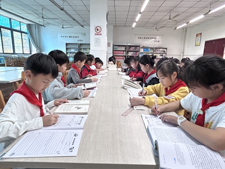 当天阅读时间,所属班的学生齐聚在学校图书室,每人带着自己钟爱的书籍或者图书室中的书籍,迫不及待地开始了阅读之旅。图书室内弥漫着书香气息,学生们专注地沉浸在书海中。