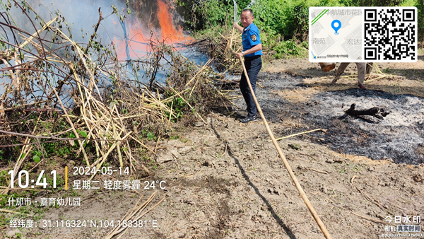 四川新闻网消息 5月14日上午,什邡市城管执法大队四中队执法人员在巡查执勤时,看到金沙江路嘉育幼儿园对面冒出滚滚浓烟,闻到空气中散发着烧焦的味道,执法队员立即前往起火点,看到一处空地上杂草丛正燃起熊熊大火,火势不断蔓延,情况十分危急,如果不及时控制,后果将不堪设想。