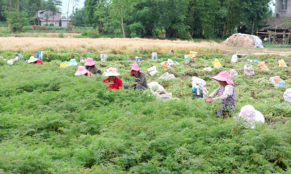 “我们采取一季水稻一季药材的‘粮药轮作’模式,一共种植了200余亩川芎,从5月中旬开始采收,到6月底结束,预计亩产在2000斤左右。高峰期在田里务工的村民达100余人。”李怀富家庭农场负责人张寿霞告诉记者,今年川芎的市场价为每斤18元左右,尽管行情相比往年不是很好,但她家的川芎质量好、品质佳,深受收购商、药材厂的青睐,销路一点也不愁。为了带动周边农户种植川芎,促进增收,他们还为村民提供种苗、化肥、技术,并保底价收购。