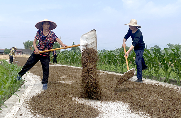 初夏时节,在玉泉镇玉江村的大邦中药材种植合作社基地里,一棵棵车前子植株高大,茎叶饱满,细圆的穗子在风中飘摇,远远望去,田野就像铺上了一块绿色地毯。趁着晴好天气,村民们正忙着开镰收割、装运晾晒。