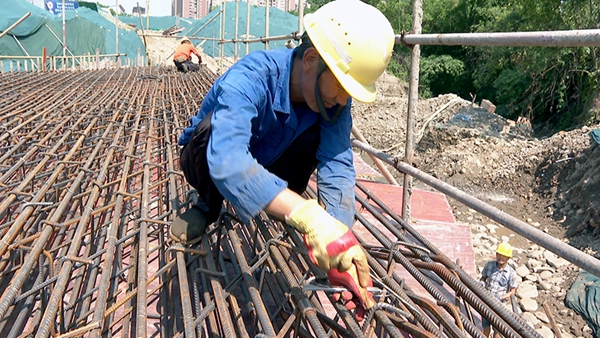 5月24日上午,在常兴街新建道路建设现场,工人们正顶着烈日进行道路箱涵盖板钢筋绑扎和混凝土浇筑工作“目前,我们正在做的是月亮泉公园排水箱涵施工,预计今年7月初完工。等到下穿隧道的铁路施工完成后,我们继续进行道路两段斜坡施工。”项目现场负责人徐甲海说,整条常兴街新建道路将在2025年3月底完成贯通,实现通行。