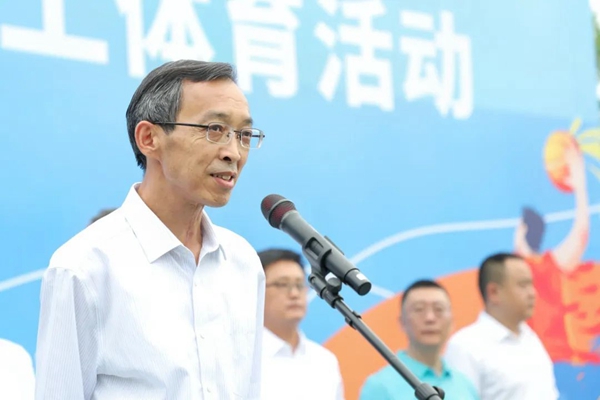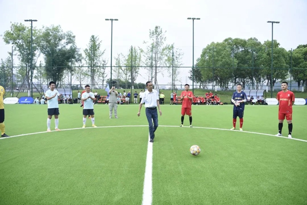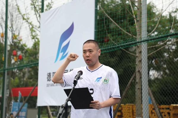 陈仕恩宣布“同心同向 奋楫逐光”2024“德阳发展·德阳农商行”杯职工体育活动正式开始,并为首场友谊赛开球。