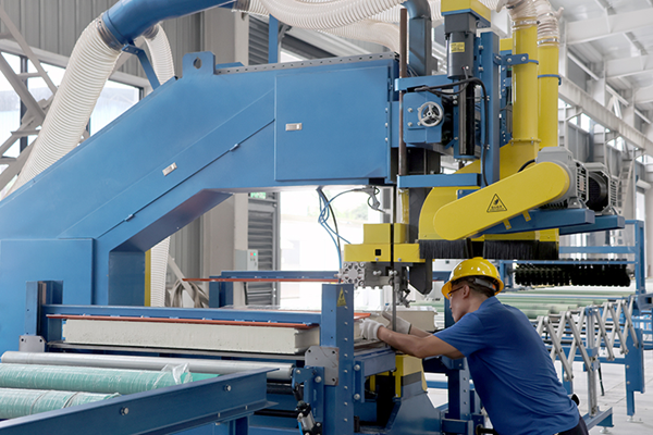 在位于绵竹高新区的四川医净科技集团有限公司的生产车间,聚氨酯冷库纳米净化板全自动生产线正马力全开,工人们在手工纳米净化板冷压线生产区有条不紊地进行手工填棉等工序,生产完成后的成品纳米净化板整齐码垛,一派繁忙有序的生产场景。