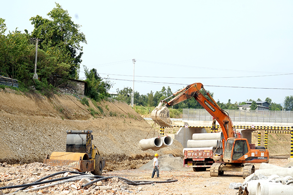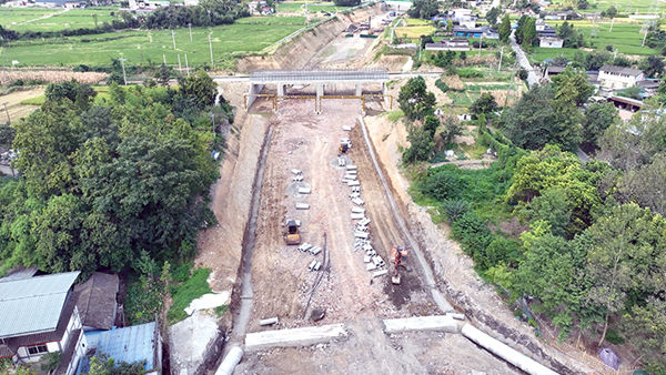 8月28日,记者在S216改建工程汉旺段大柏林村段看到,大型机械来回穿梭,工人们头顶烈日,忙着进行路基建设和涵管安装。前方不远处,跨线桥盖梁建设正在加速推进。
